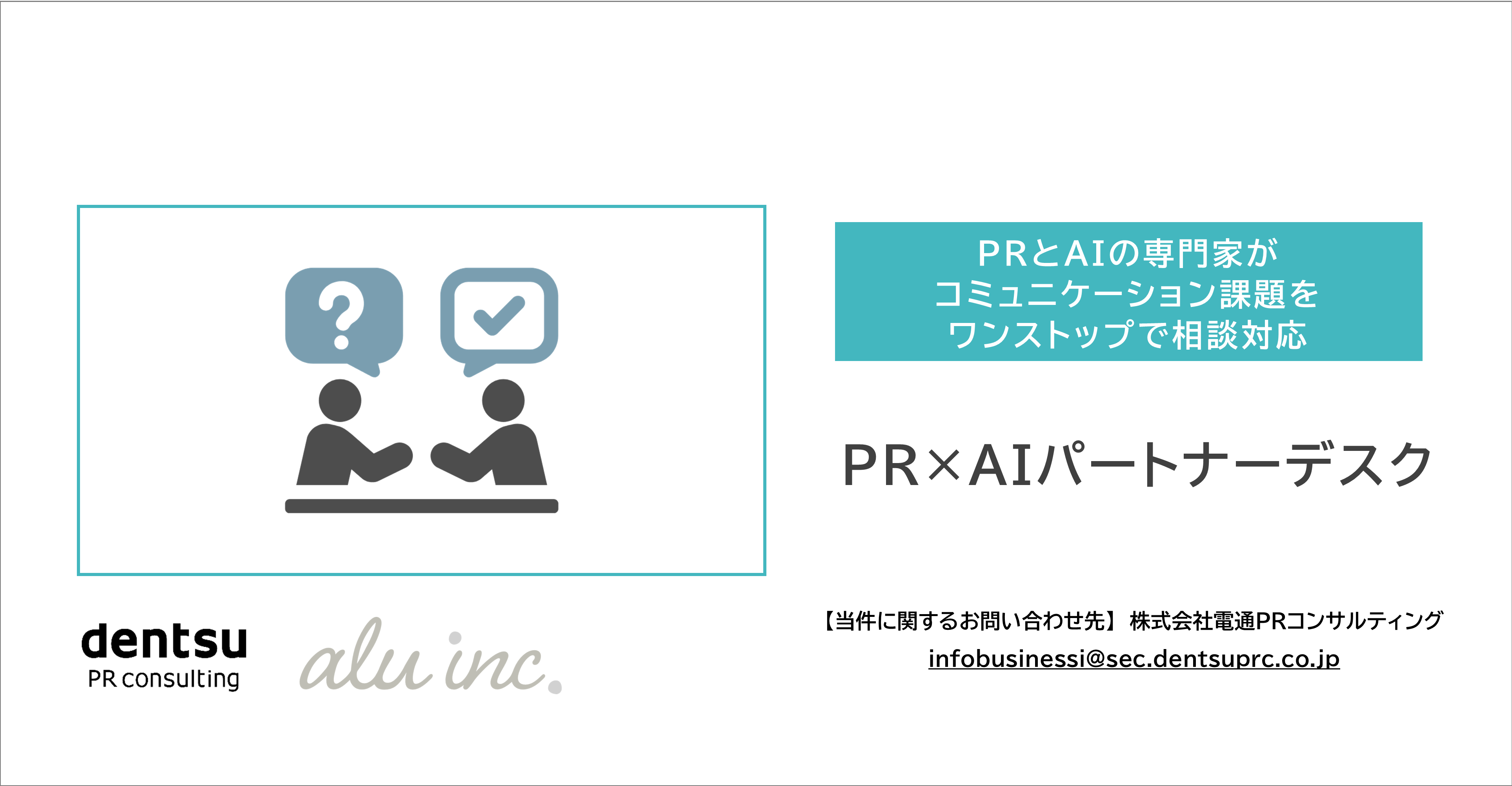 企業・団体の広報・PRに関するあらゆる悩みの中でも、特にPR業務におけるAI活用に関するお困りごとに対応する「PR×AIパートナーデスク」は、電通PRコンサルティングとアル株式会社が共同で提供する、オンラインの相談窓口サービスです。